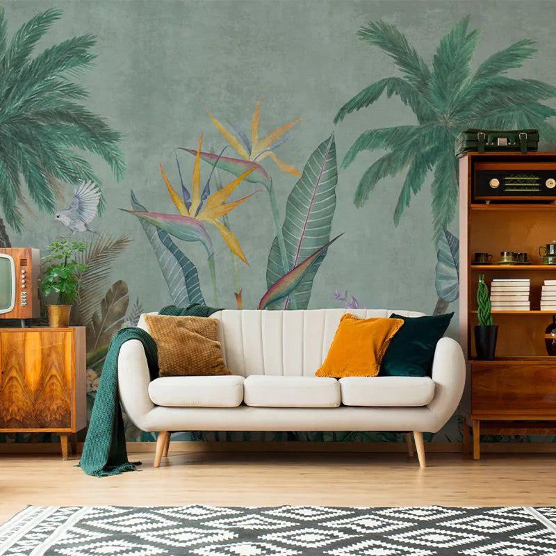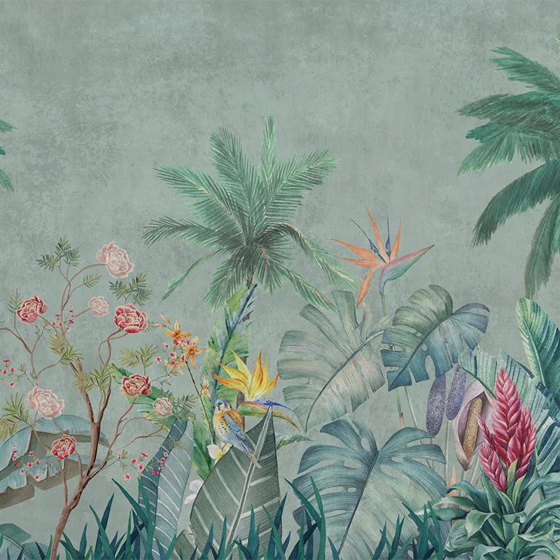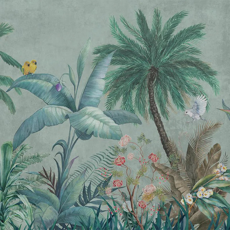 Created for lovers of nature and elegance, this wallpaper captures the essence of faraway lands bathed in sunlight, caressed by sea breezes, and alive with intriguing animals. Layers of tropical flora and fauna blend harmoniously in a warm palette of yellows, soft pinks, and muted greys — transforming your space into a serene, eternal landscape of green.